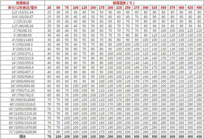 不同溫度下,不同管徑的保溫材料厚度不同。